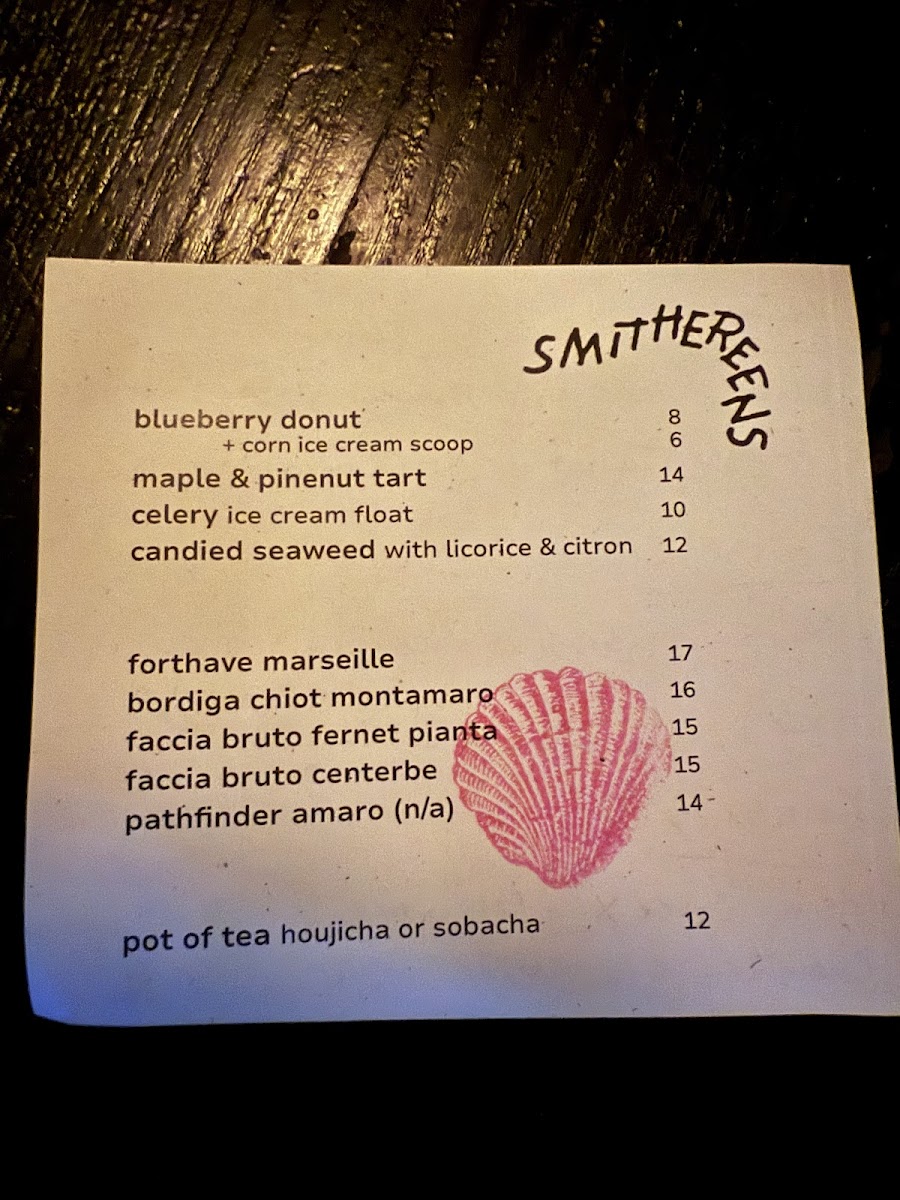 For dessert, Smithereens surprises with delightful offerings like a celery ice cream float that mirrors a fun soda experience and a warm blueberry donut accompanied by corn ice cream. The minimalistic, speakeasy vibe of the restaurant enhances the dining experience, making it a cozy spot to enjoy a glass of wine or a signature cocktail like the Seaweed Martini. At Smithereens, every dish tells a story, inviting you to explore and savor creative culinary artistry.