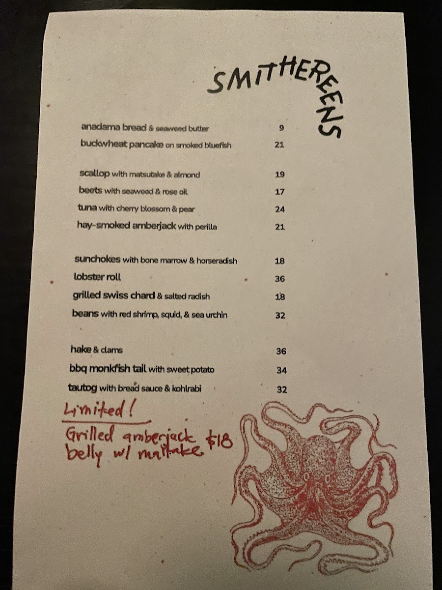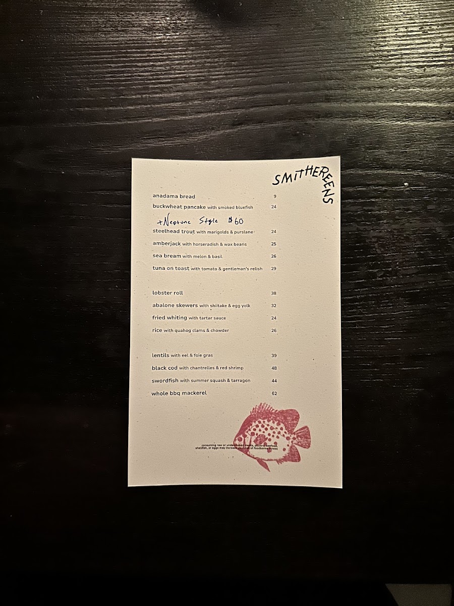 Welcome to Smithereens, a charming American restaurant located at 414 E 9th St, New York, NY. This hidden gem offers a captivating seafood-centric menu that’s drawing attention from food enthusiasts. The highlight of the menu includes adventurous dishes like their mouthwatering lobster roll and innovative buckwheat pancake with smoked fish. Guests rave about the unique flavor combinations, such as the fish head terrine and lightly fried whiting, perfect for those seeking fresh and exciting seafood preparations.